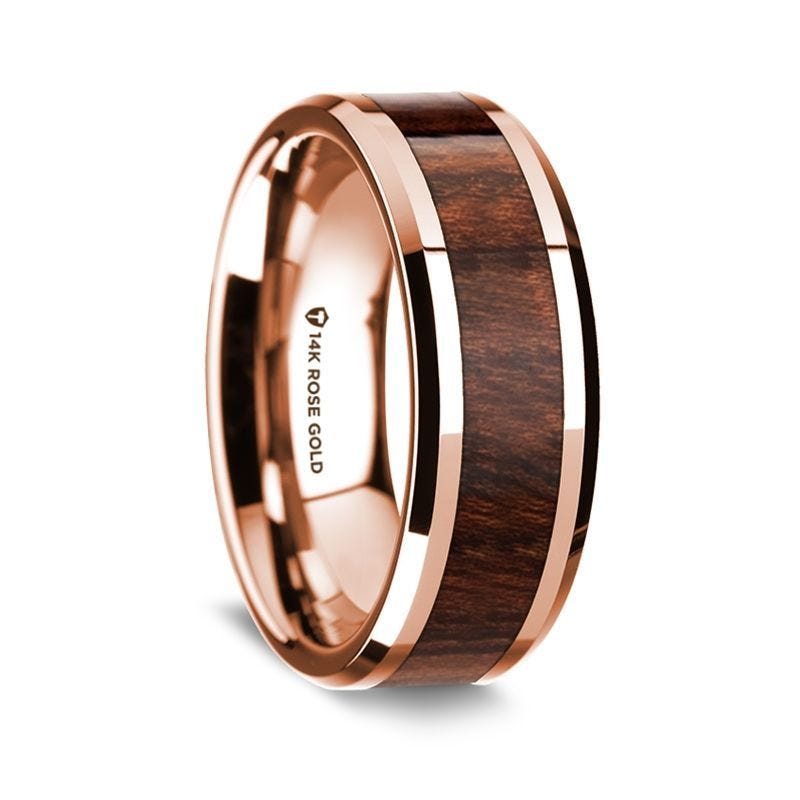 14K Rose Gold Polished Beveled Edges Wedding Ring with Carpathian Inlay - 8 mm