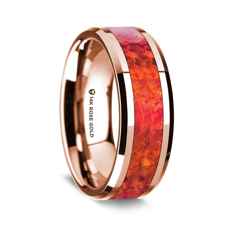 14k Rose Gold Polished Beveled Edges Wedding Ring with Red Opal Inlay - 8 mm