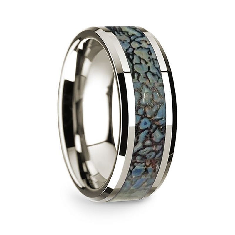 14k White Gold Polished Beveled Edges Wedding Ring with Blue Dinosaur Inlay - 8 mm