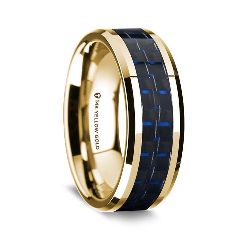 14K Yellow Gold Polished Beveled Edges Wedding Ring with Black and Dark Blue Carbon Fiber Inlay - 8 mm
