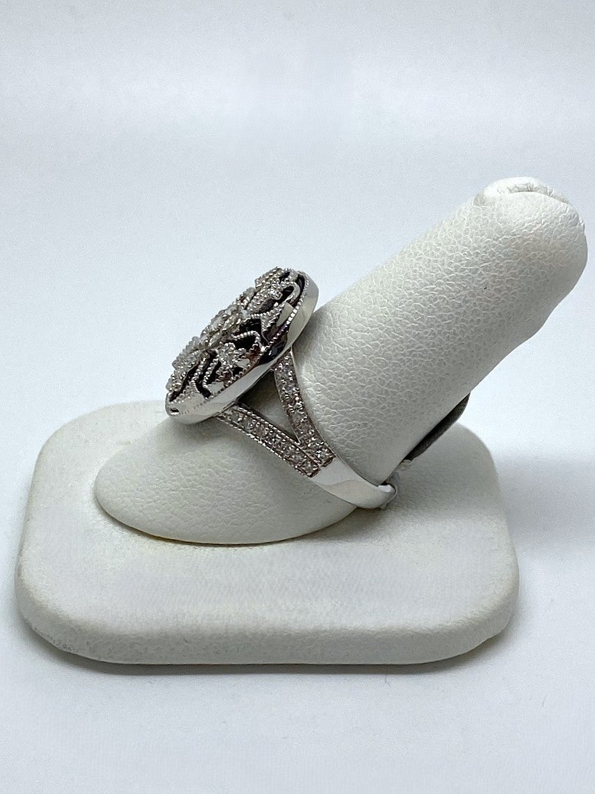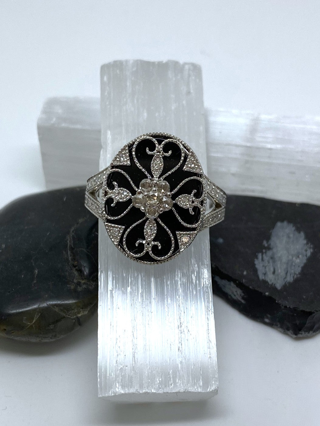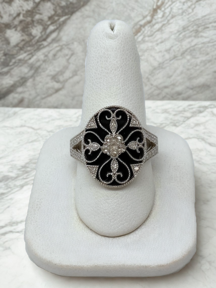 Celebrate the 1920s Art Deco style with this dazzling 14 karat white gold filigree beauty, inlaid with black Onyx and glittering natural Diamonds totaling 0.35 carats.