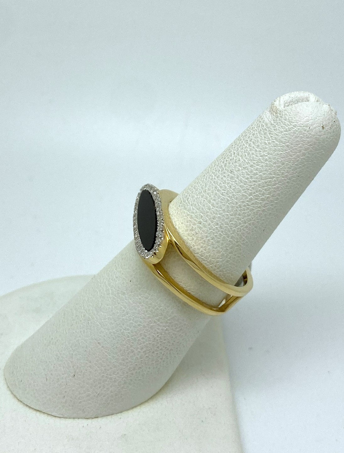 Unique yet classic, this statement ring features a 14 karat yellow gold double-shank setting with striking elongated black onyx nestled into a dazzling halo of natural Diamonds totaling 0.18 carats.