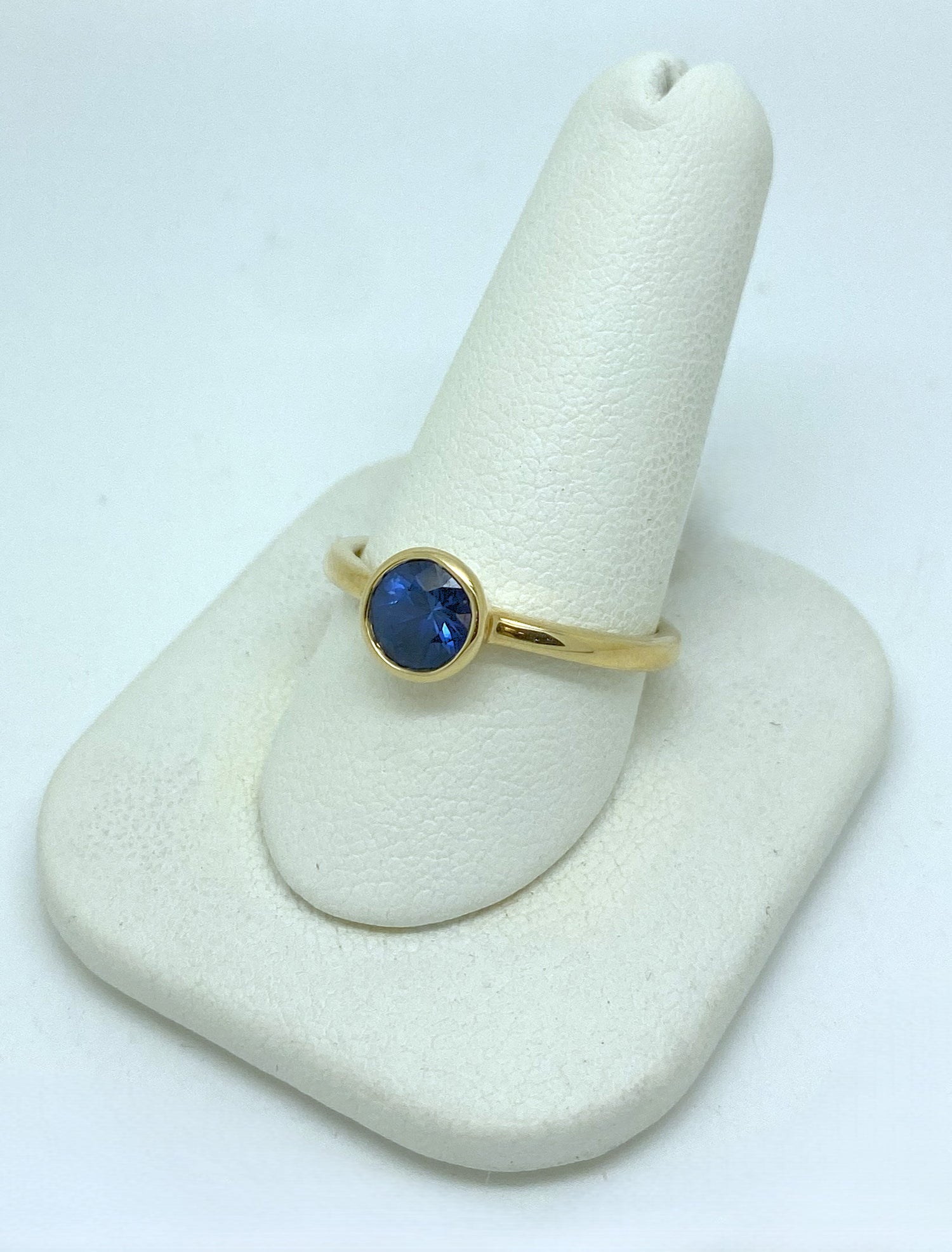 This 14 karat yellow gold bezel setting boasts a stunning rich round blue Sapphire that totals 0.78 carats.