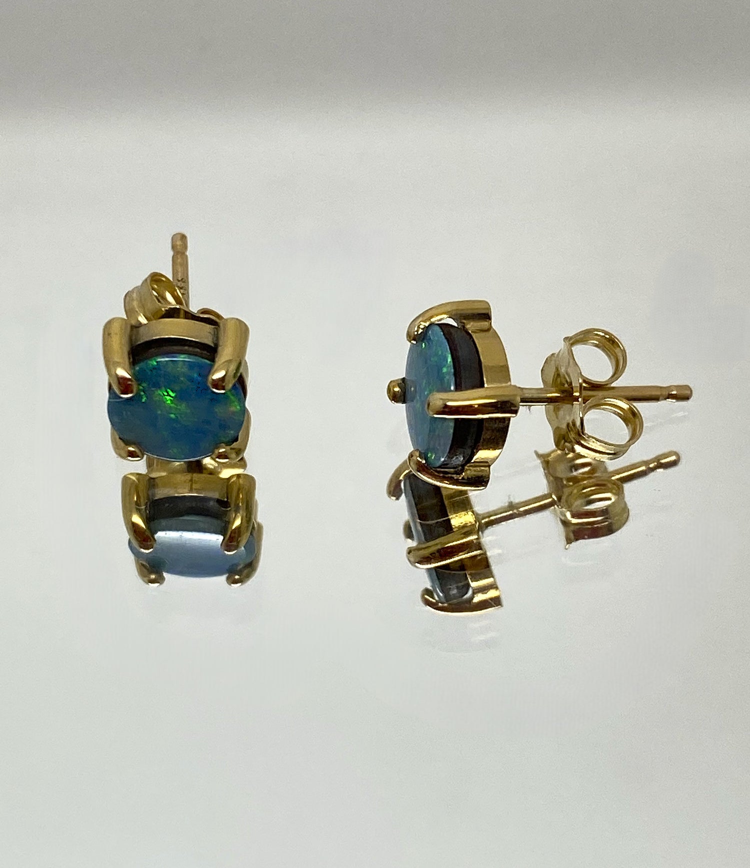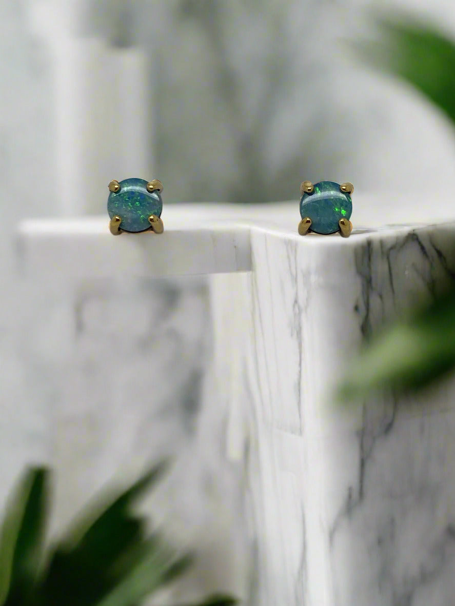 14 karat yellow-gold accents these precious 5mm round Boulder Opal stud earrings just perfectly in claw-prongs.