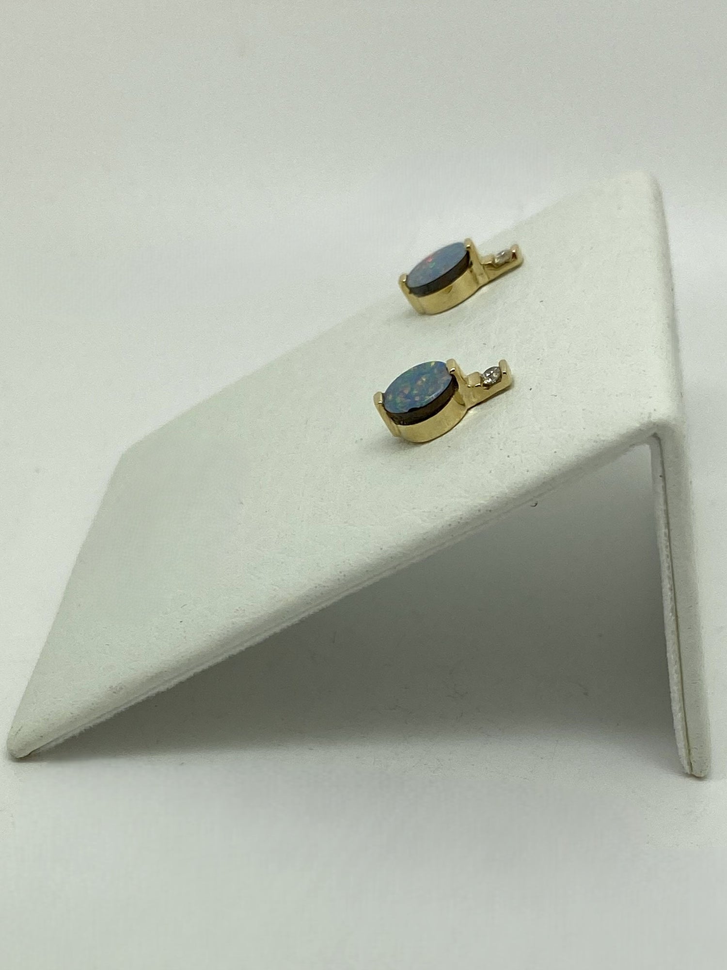 Accented by twinkling Diamonds totaling 0.05 carats and set in 14 karat yellow-gold, these unique studs make a great addition to an earring stack or as a must-need addition to the discerning Opal enthusiast's collection.