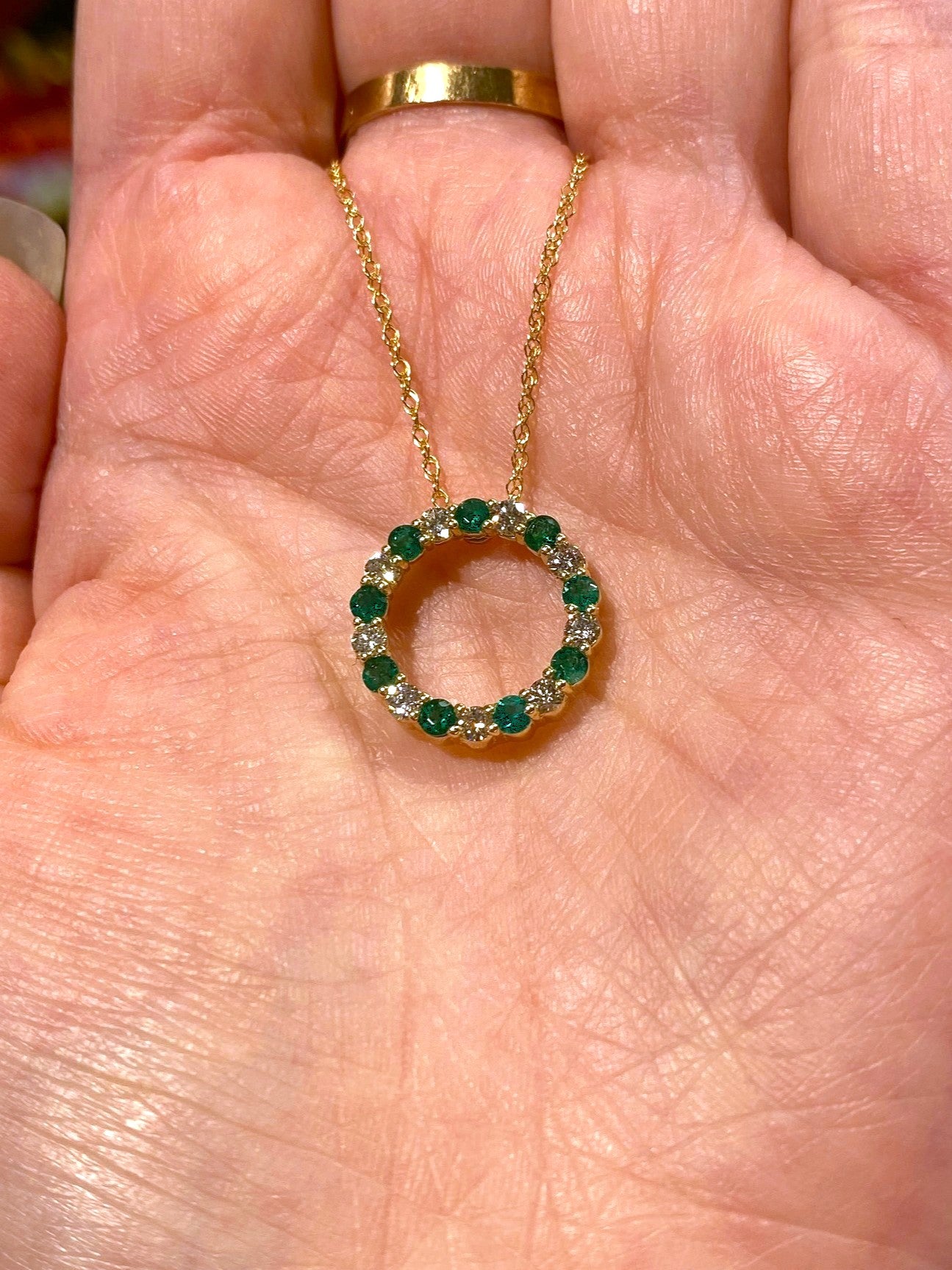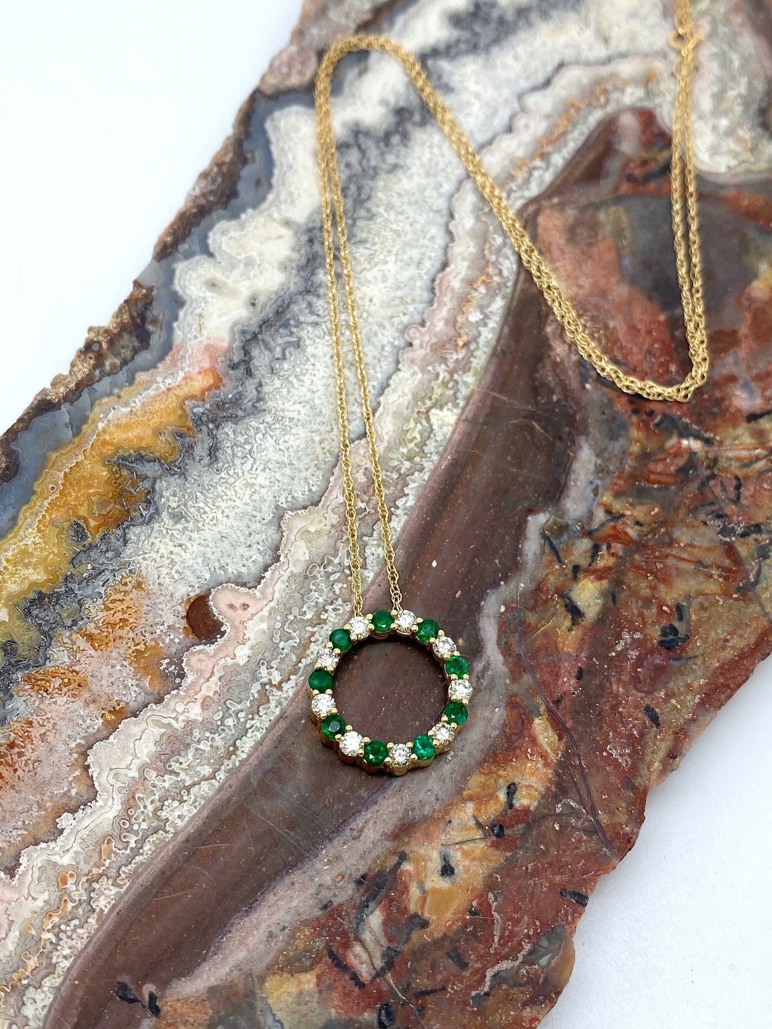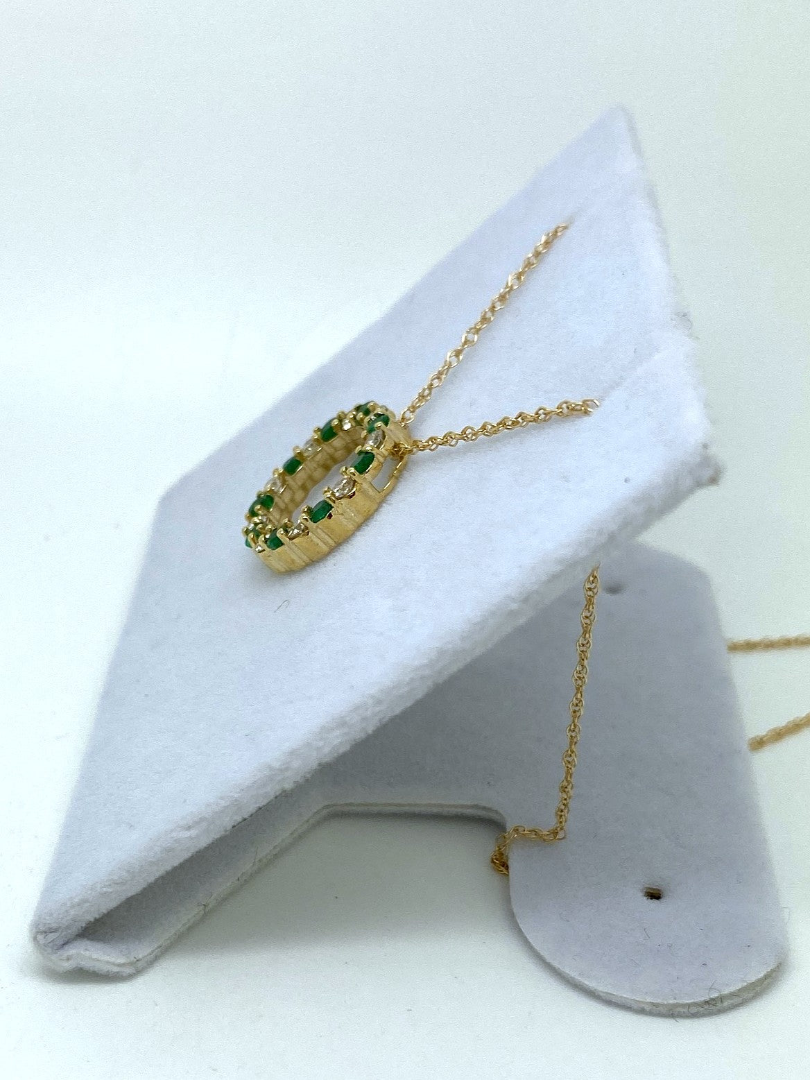 Luxury never looked so good in 14 karat yellow gold and set with rich natural Emeralds and dazzling natural Diamonds (both totaling 0.4 carats), all on an 18" gold chain.