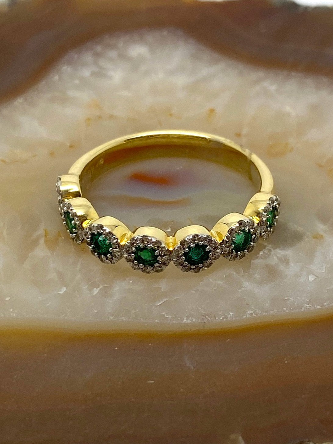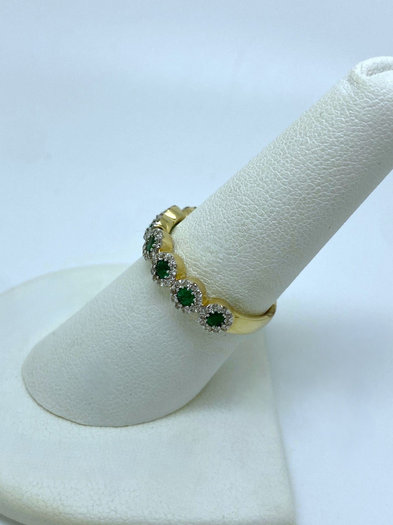 Not your typical stacker ring, this 14 karat yellow-gold band features 0.41 total carats in natural Emeralds each nestled in a sparkling halo of natural Diamonds totaling 0.34 carats reminiscent of a daisy-chain.