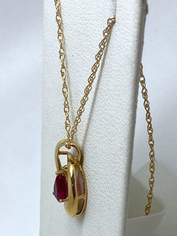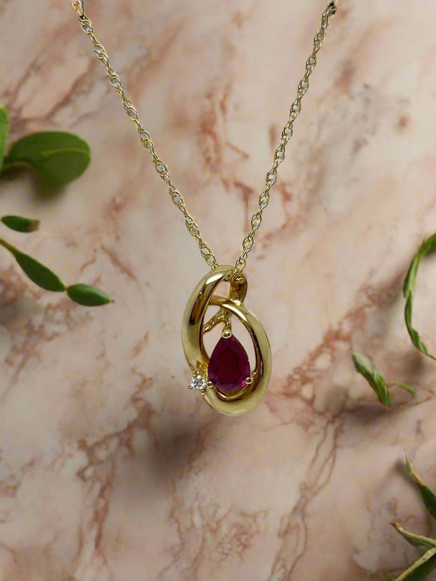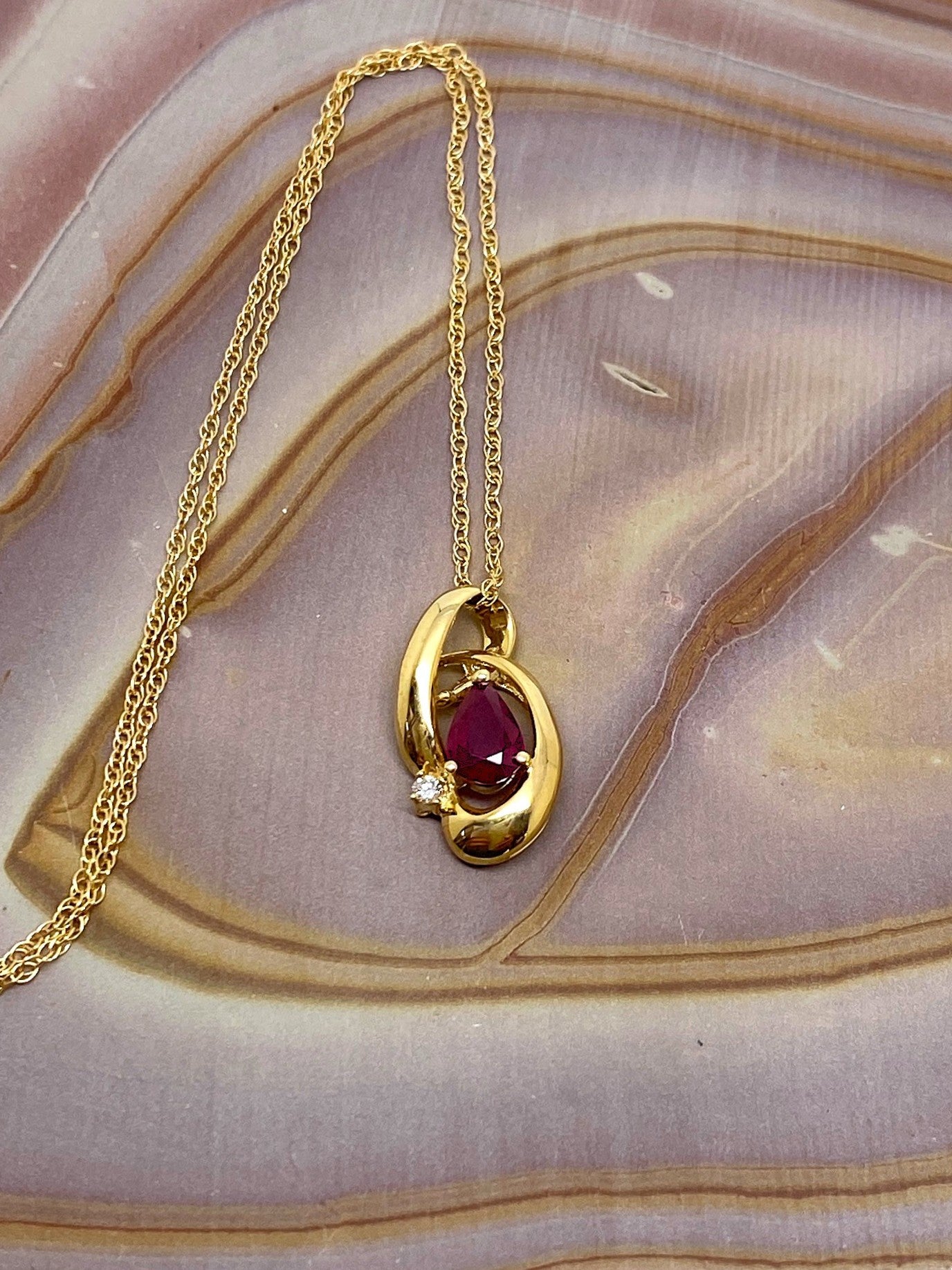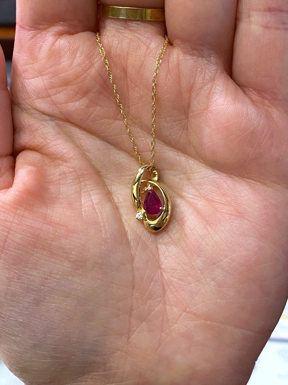This luxurious pendant boasts a 0.51 carat pear-shaped natural Ruby surrounded in ribbons of 14 karat yellow-gold, accented by a twinkling .02 carat natural Diamond on an 18" chain.