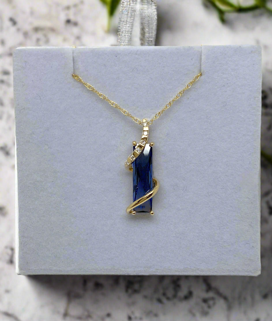 This gorgeous 4 carat Lab-grown Sapphire pendant with Diamond accents is set in 14 karat yellow gold on an 18" chain.