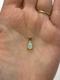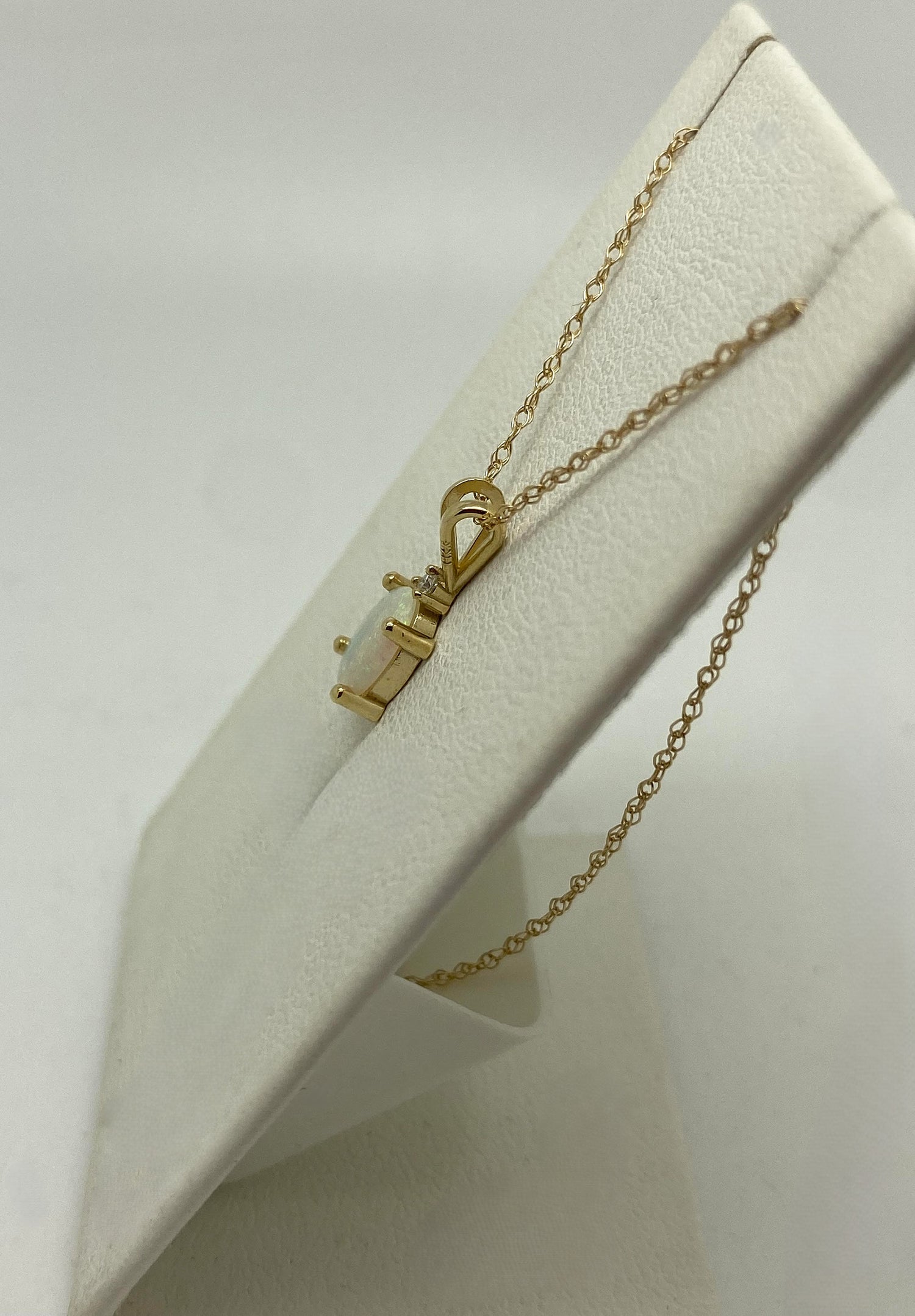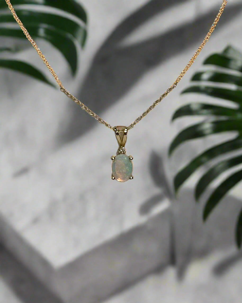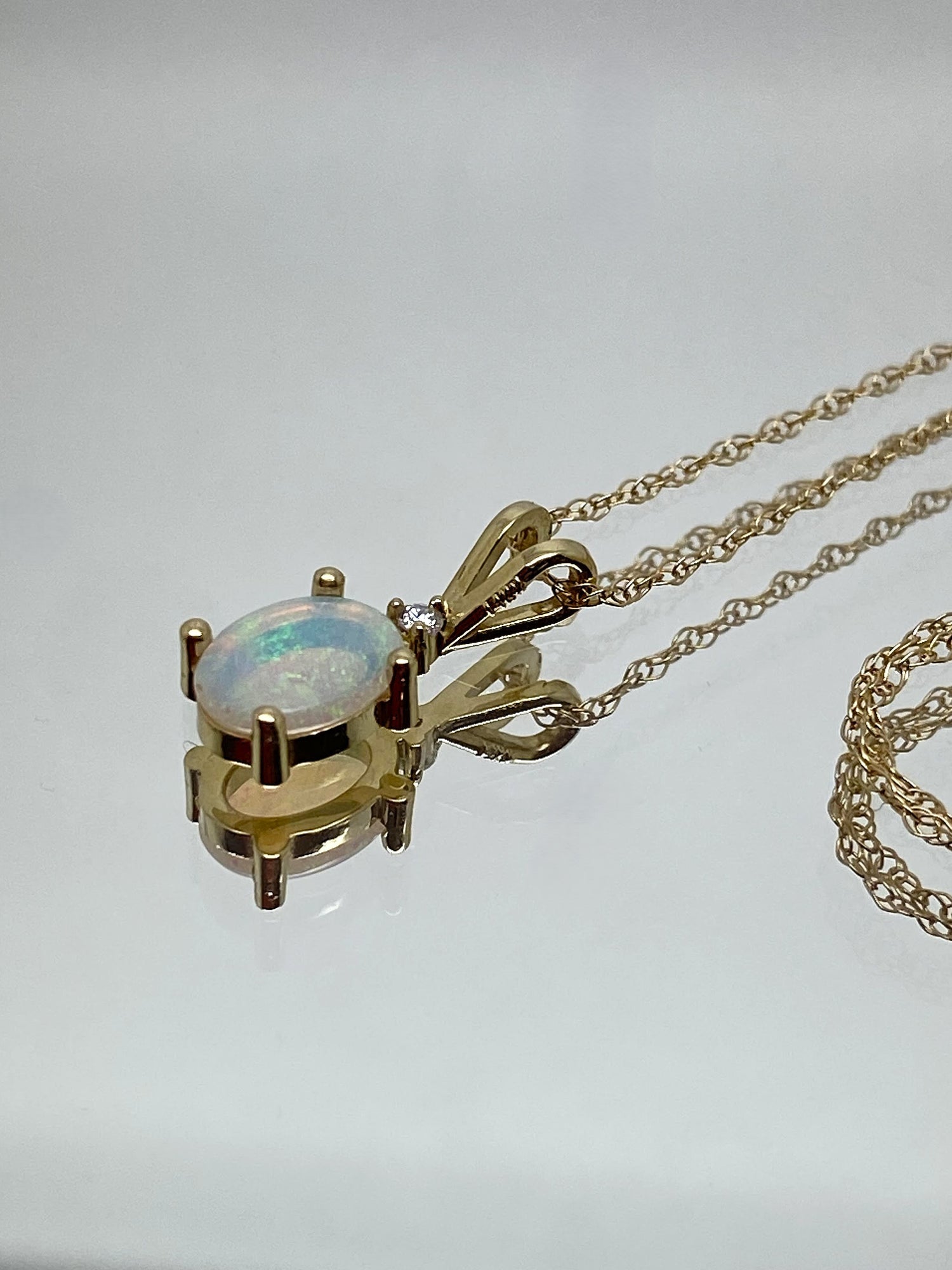 Enjoy the glowing beauty of this 7x5mm oval Australian Opal pendant set in 14 karat yellow-gold. Accented by a sparkling Diamond, this pendant comes on our standard 14 karat yellow-gold chain in 18".