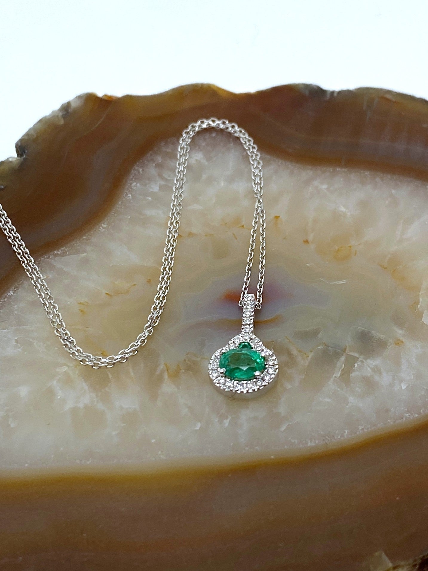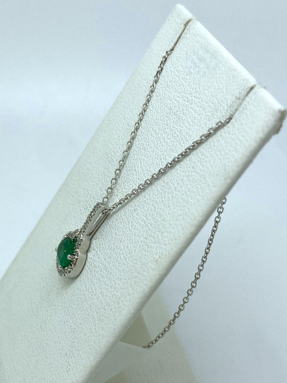Dainty and different, this 14 karat white-gold necklace has an 18" cable chain and features a natural oval Emerald totaling 0.55 carats surrounded in a delicate halo of natural Diamonds totaling 0.09 carats.