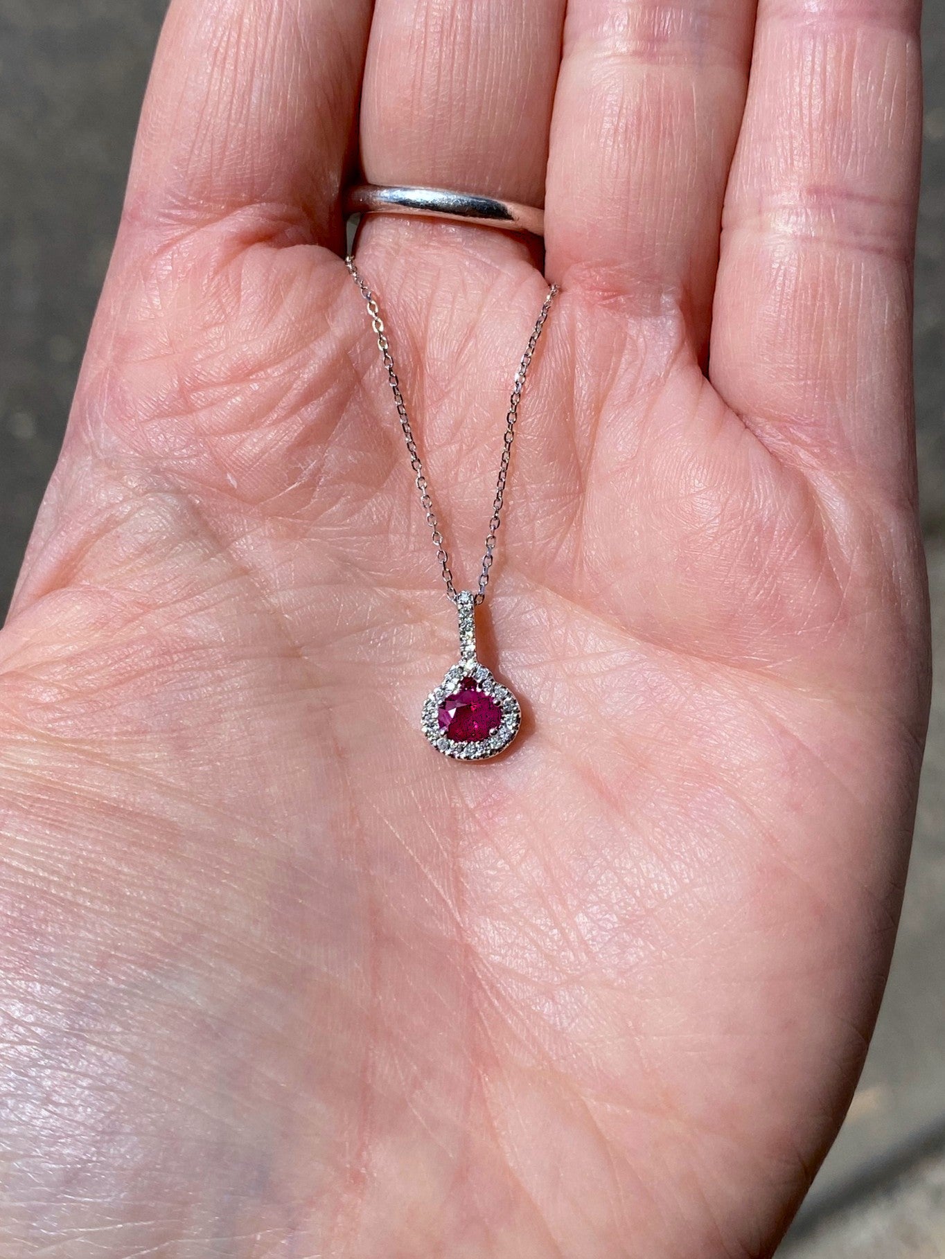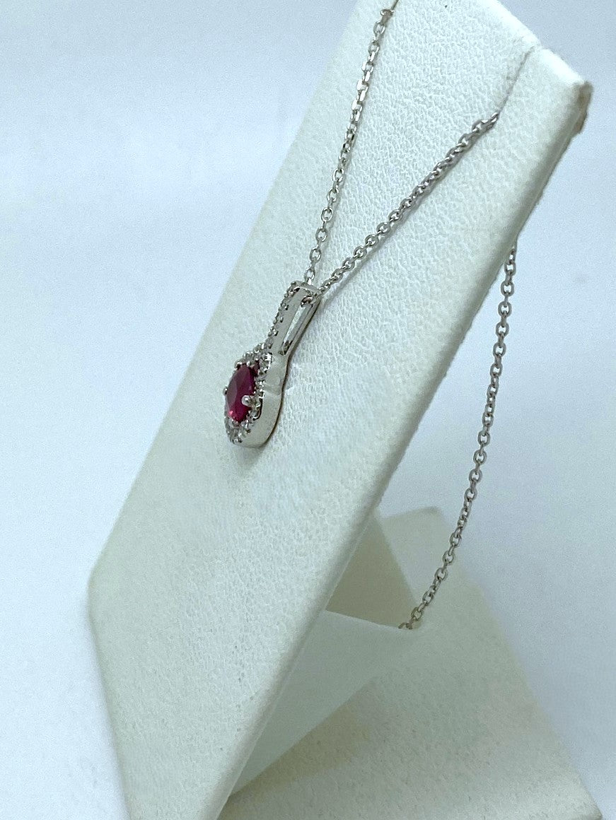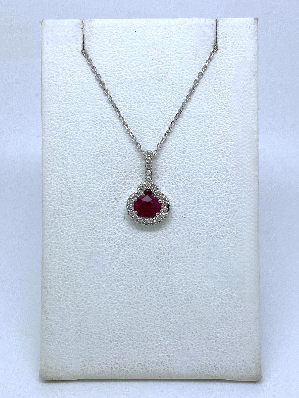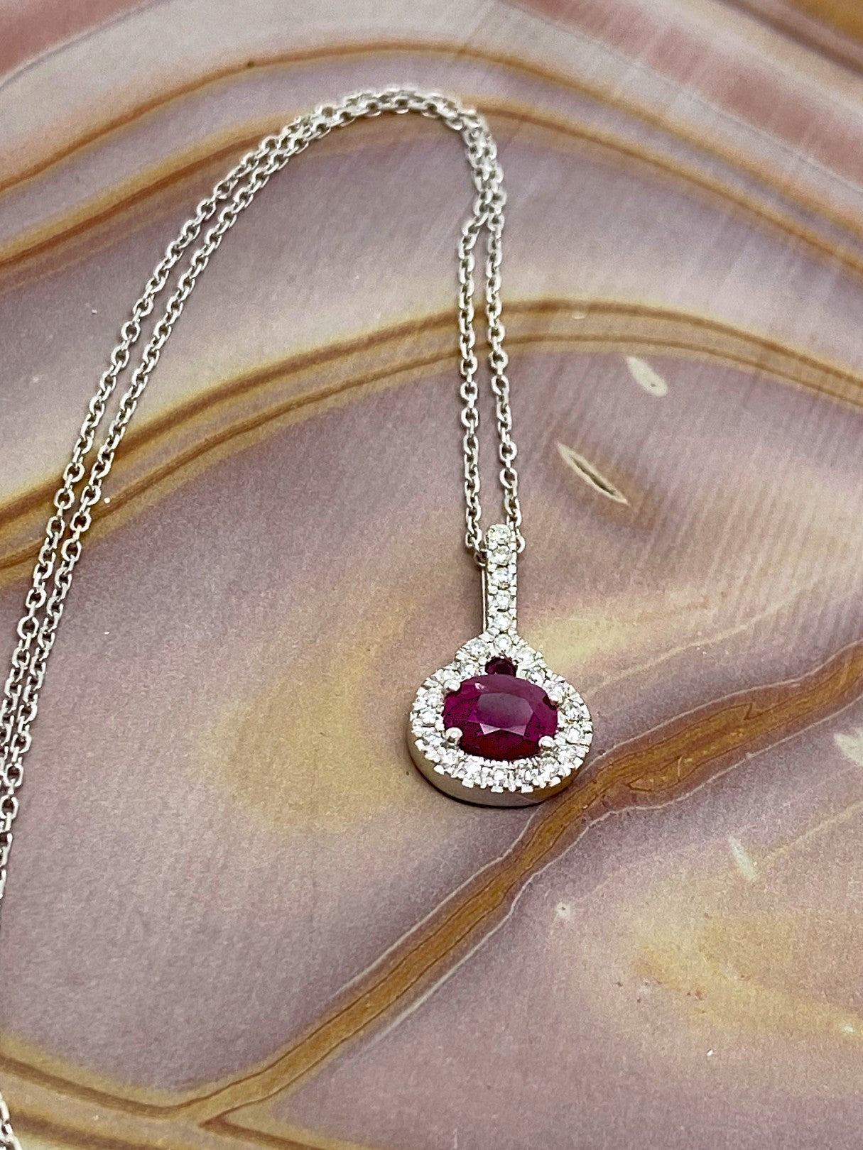 Dainty and different, this 14 karat white-gold necklace has an 18" cable chain and features a natural oval Ruby totaling 0.55 carats surrounded in a delicate halo of natural Diamonds totaling 0.09 carats.