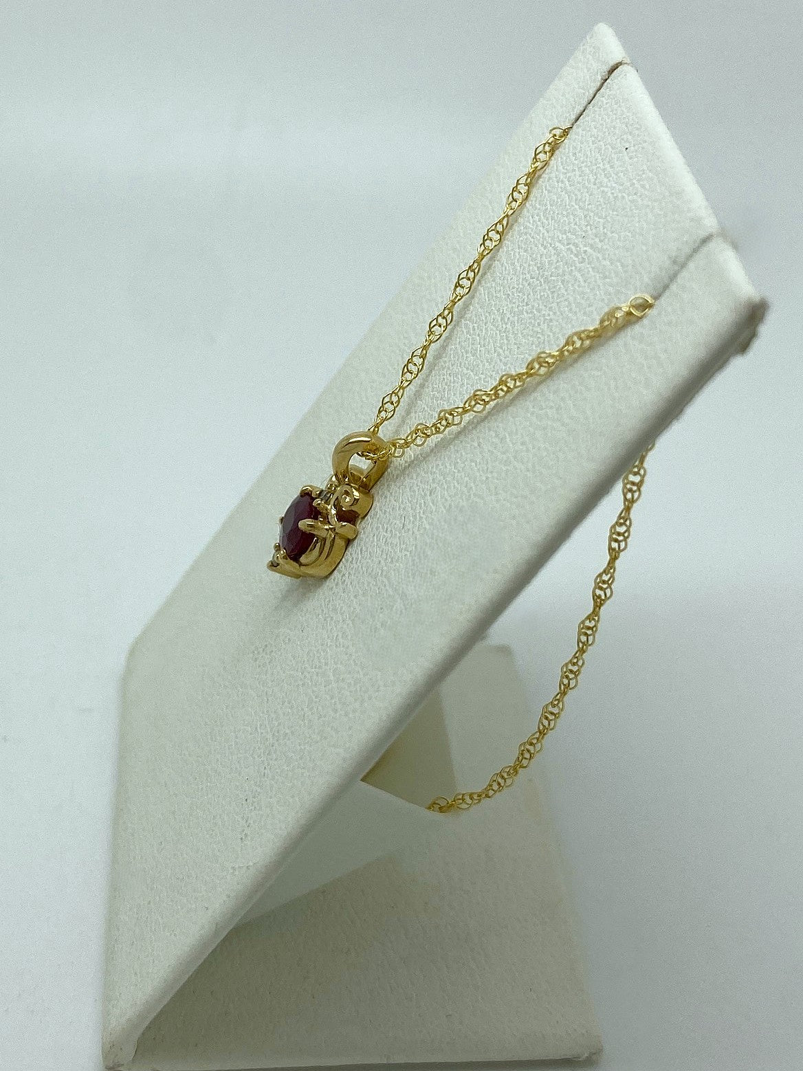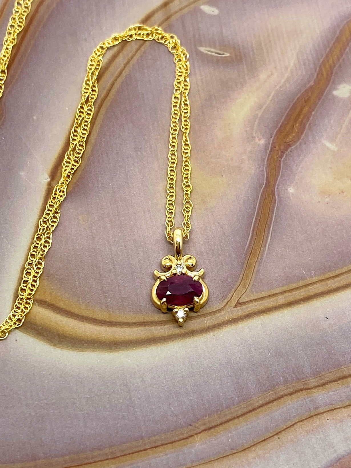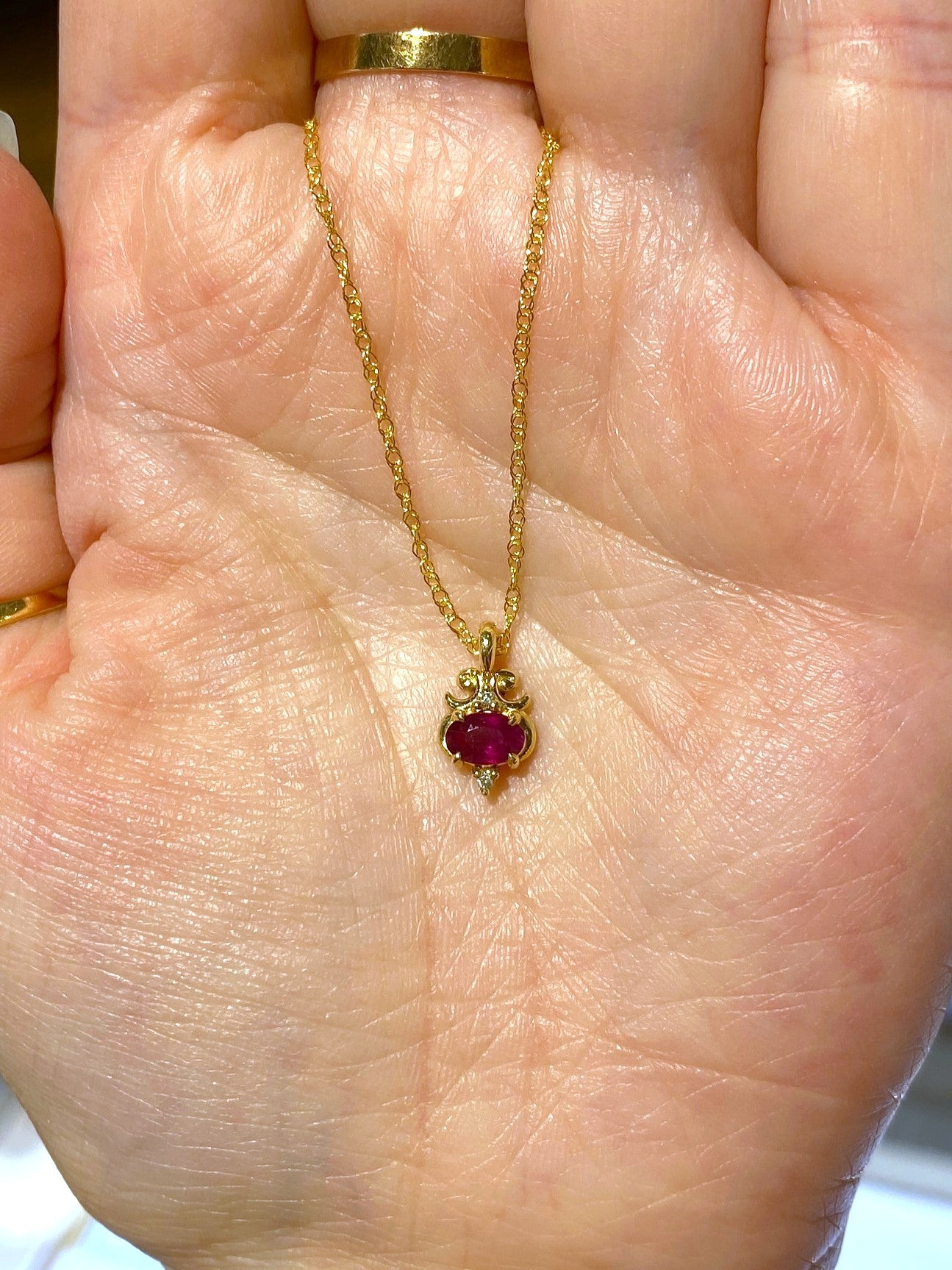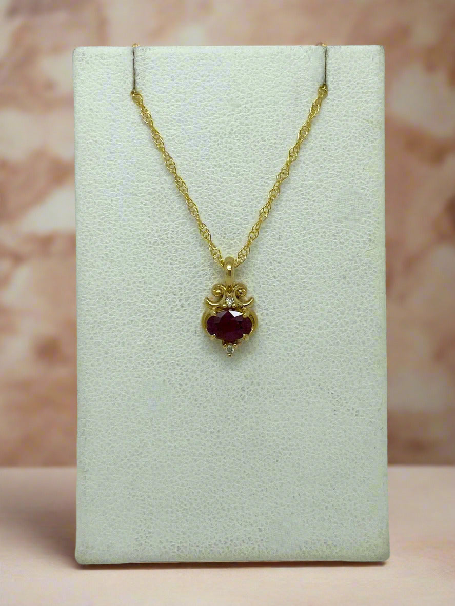 Be out of the ordinary with this vintage-inspired 14 karat yellow-gold pendant, set with a rich natural 0.48 carat oval Ruby and accented by two glittering natural Diamonds totaling 0.04 carats all on an 18 inch gold chain.