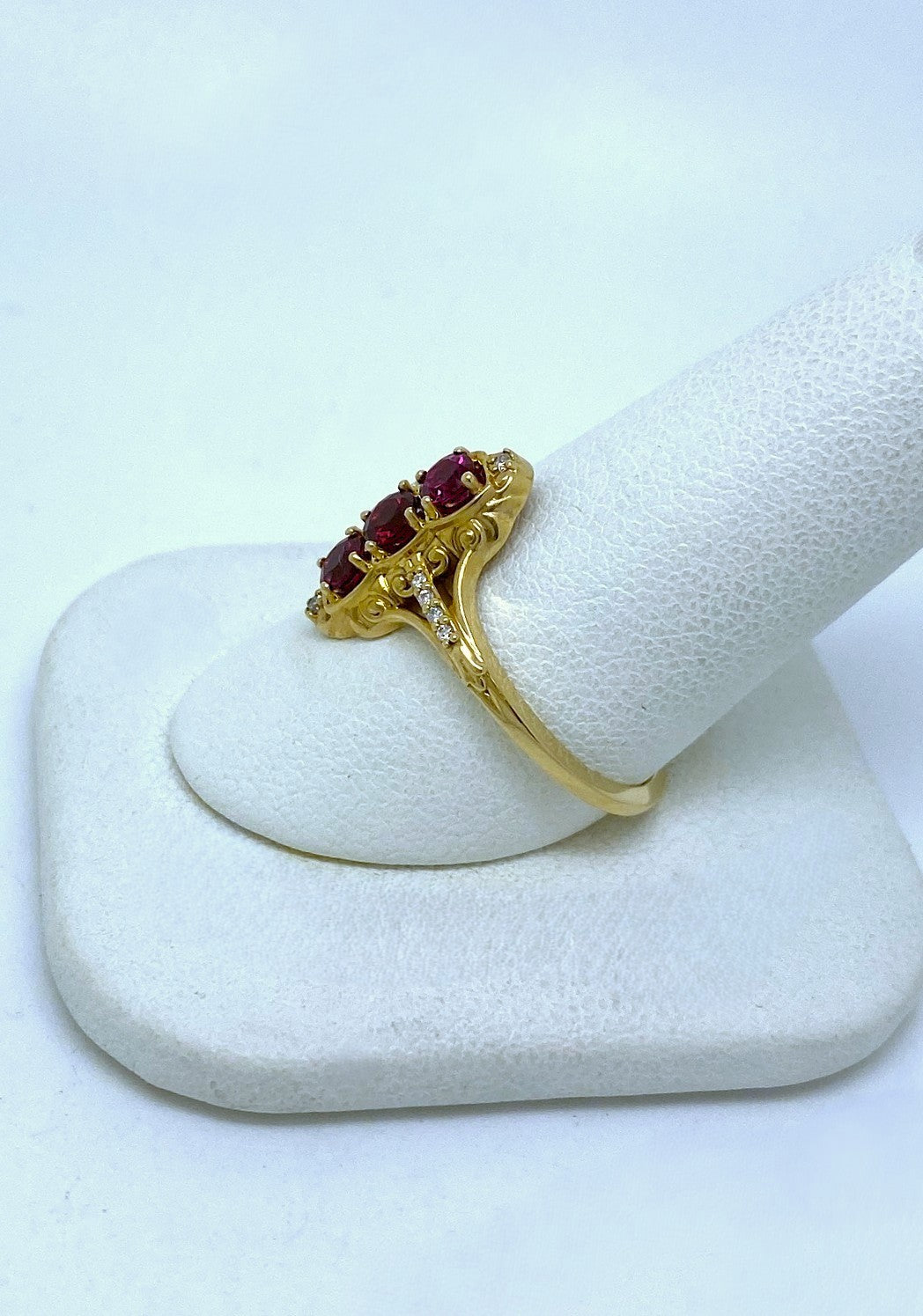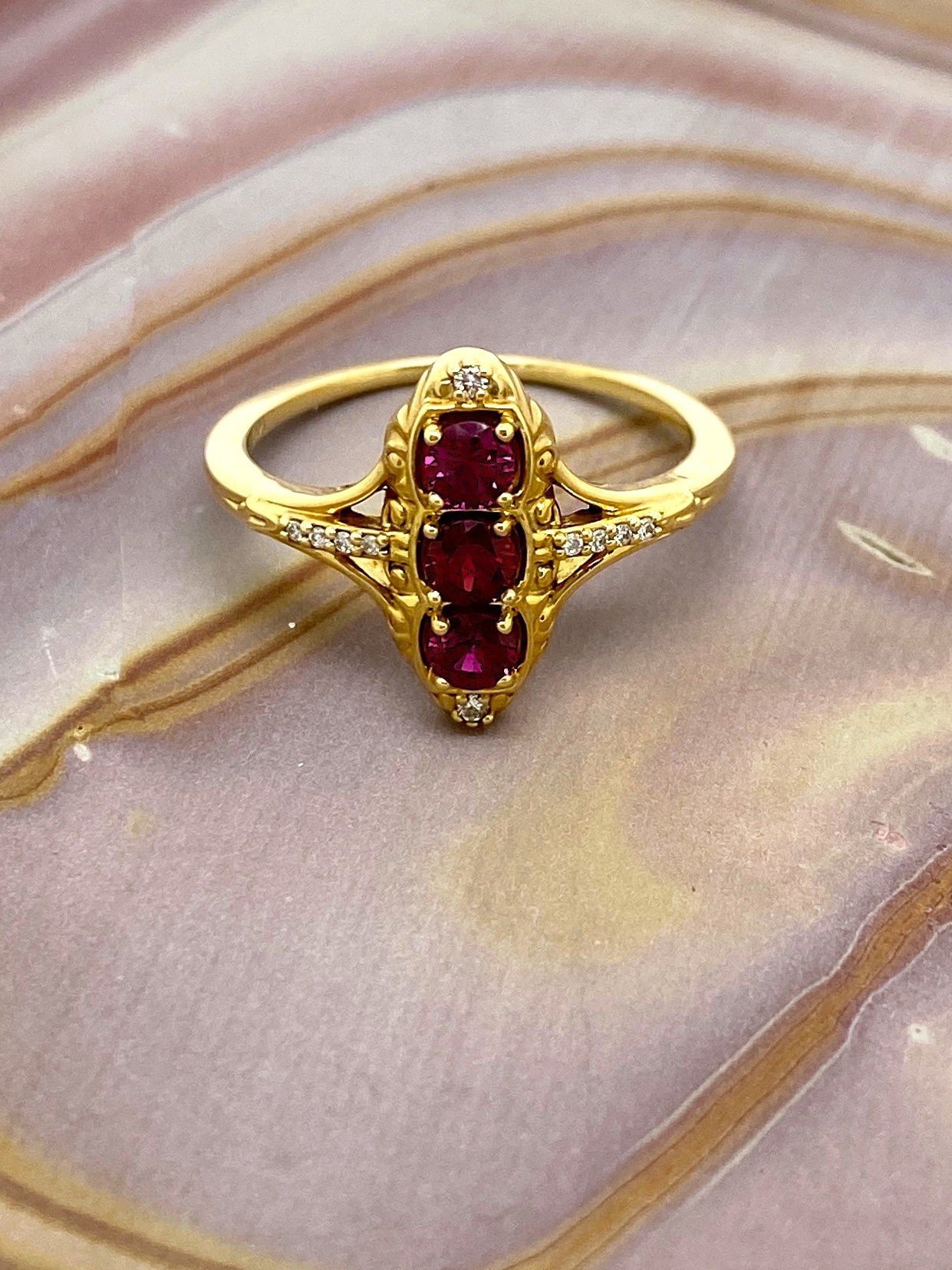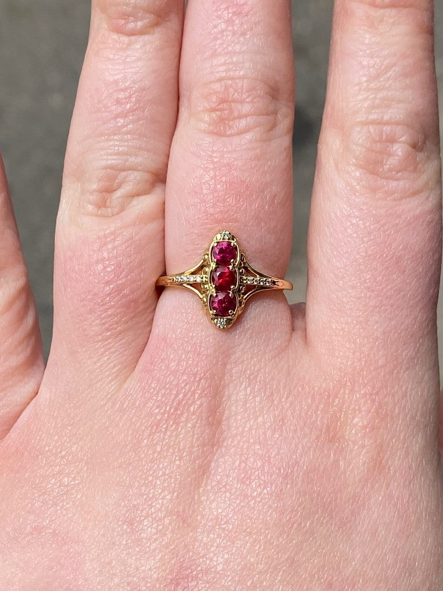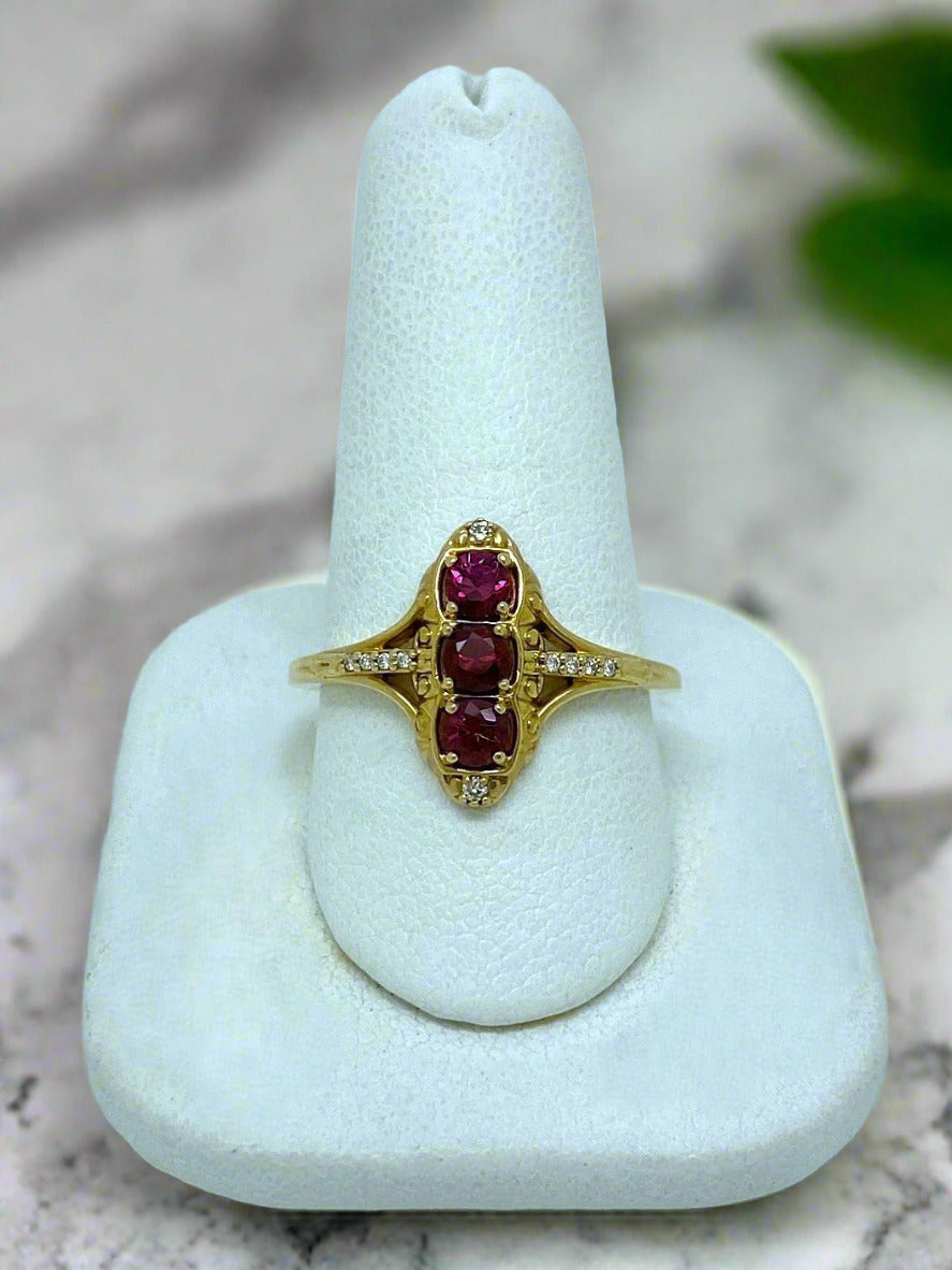 This 14 karat yellow-gold stunner is set with three GLOWING natural Rubies totaling 0.5 carat, highlighted by glittering ribbons of natural Diamonds totaling 0.04 carats.