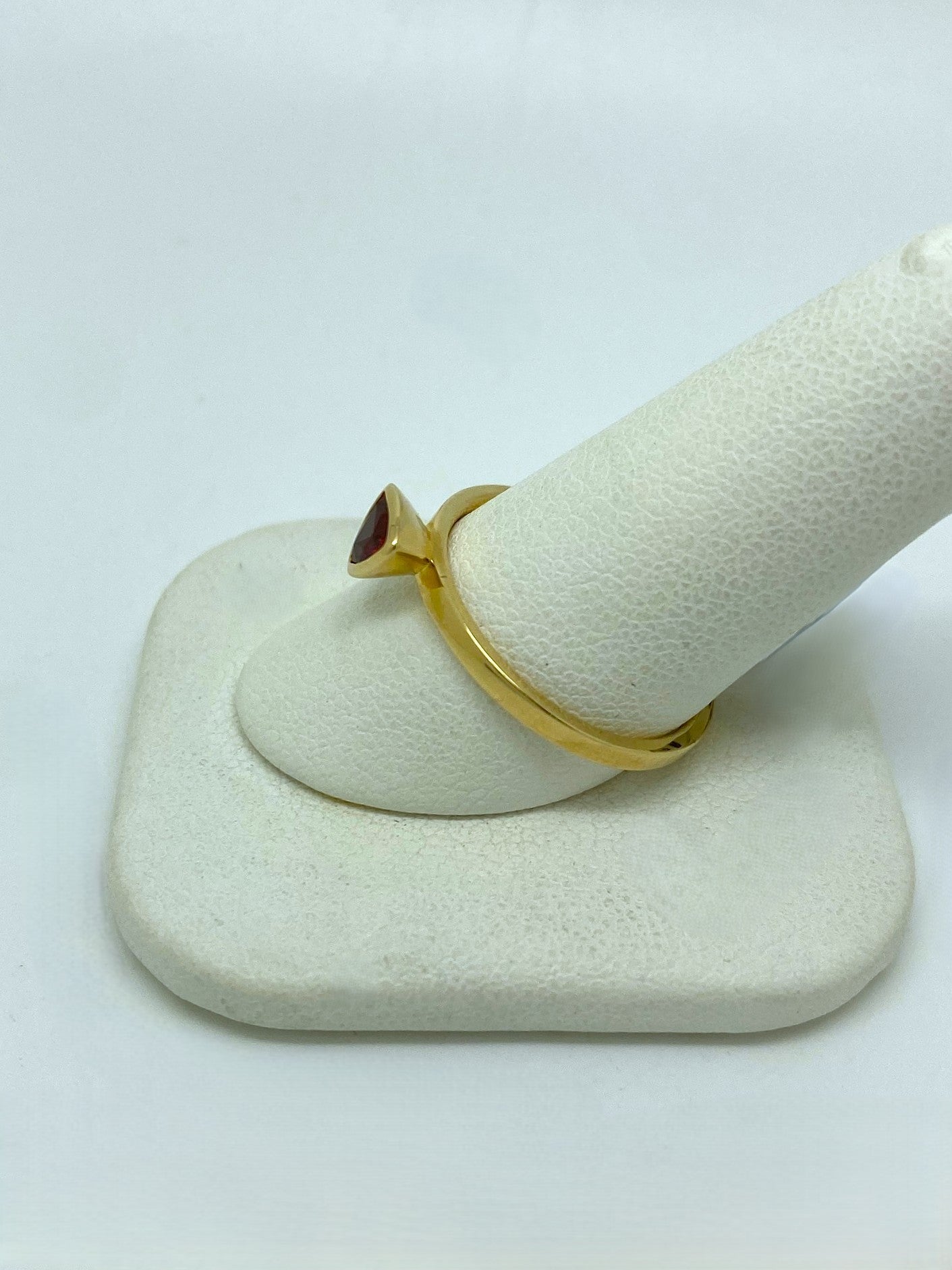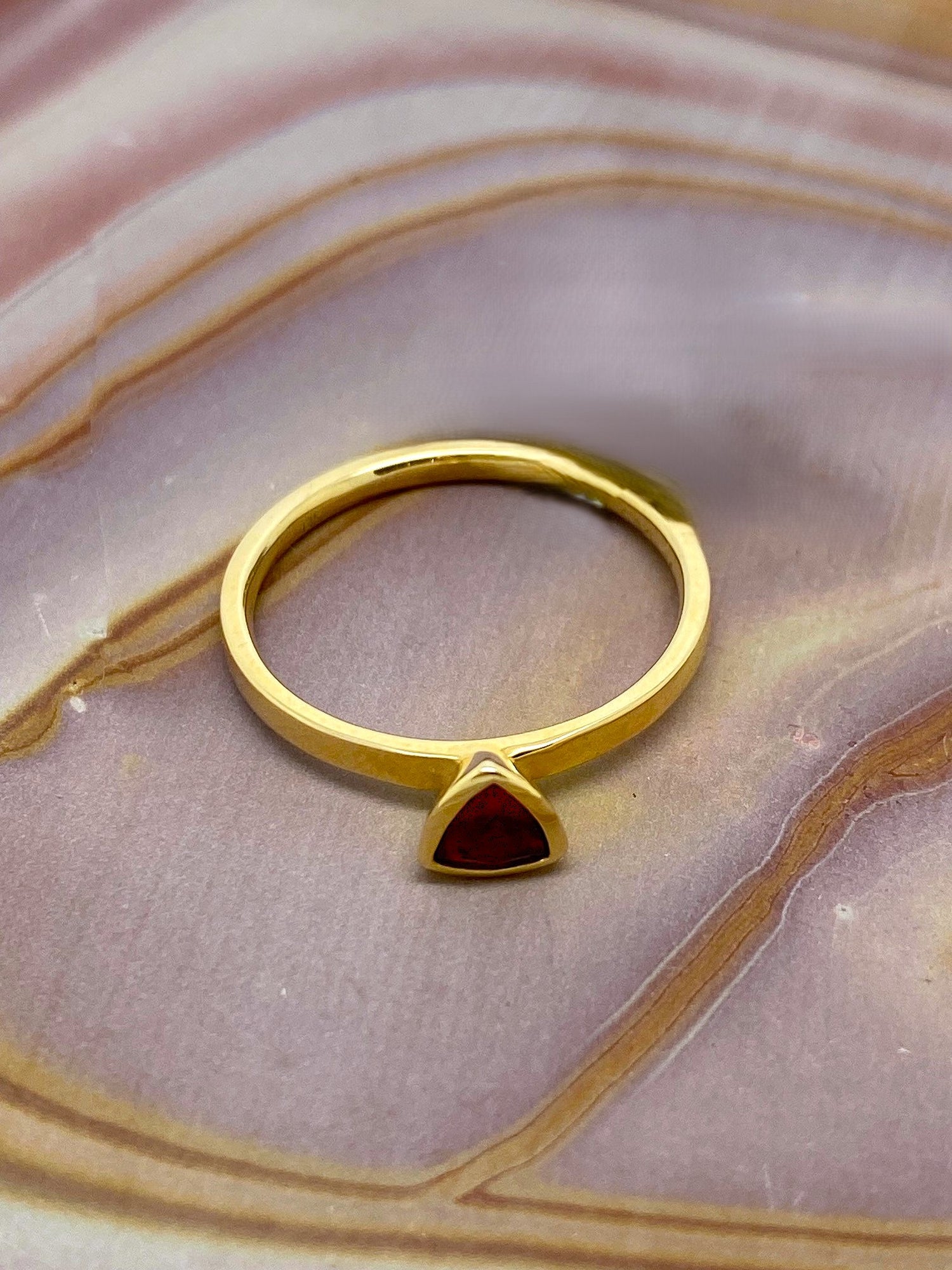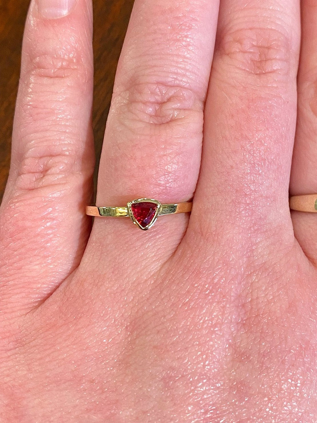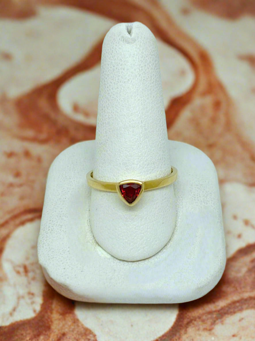 Not your average solitaire, this 14 karat yellow-gold ring is bezel-set with a natural and absolutely glowing Trillion-cut Ruby totaling 0.29 carats.