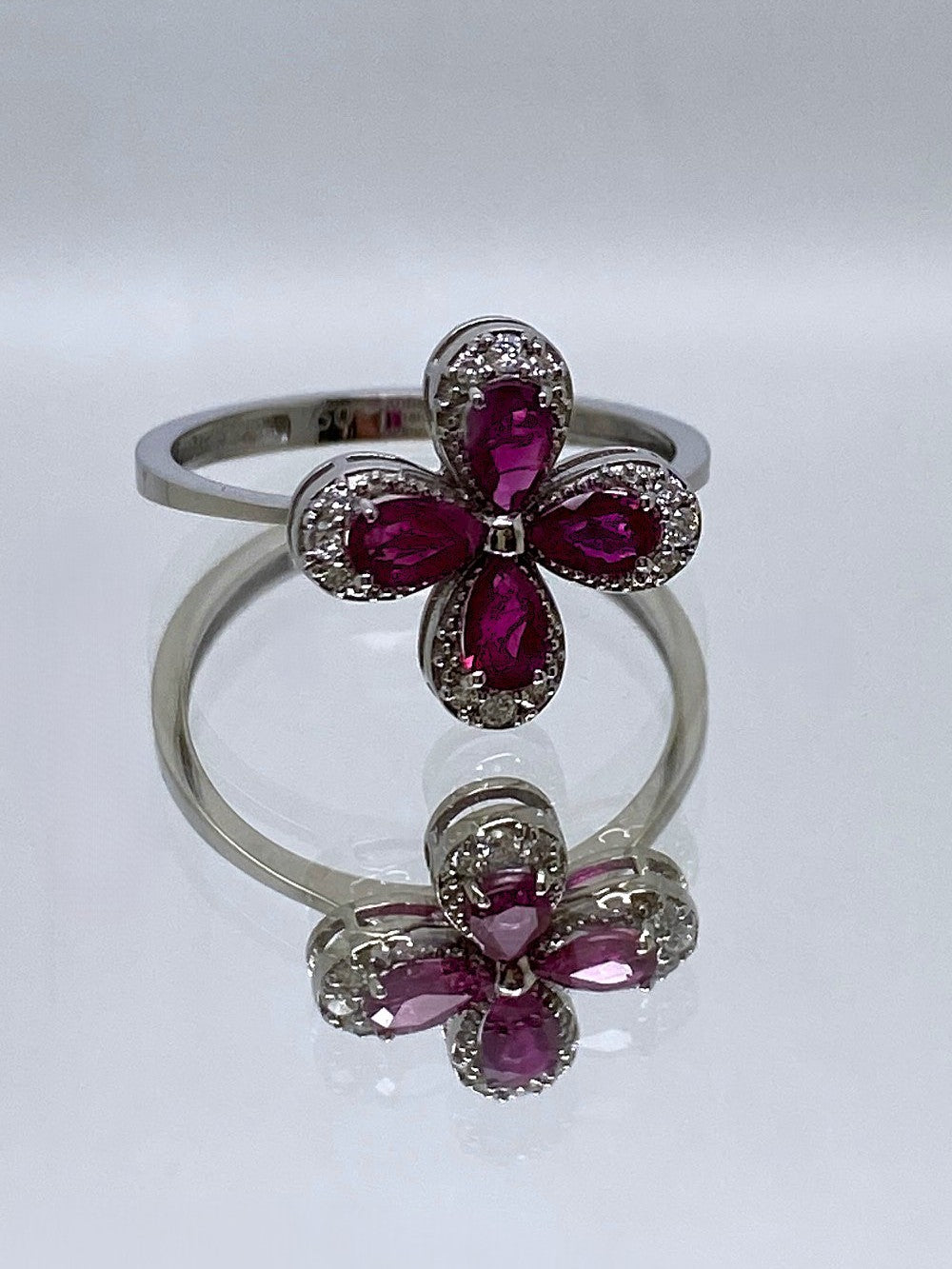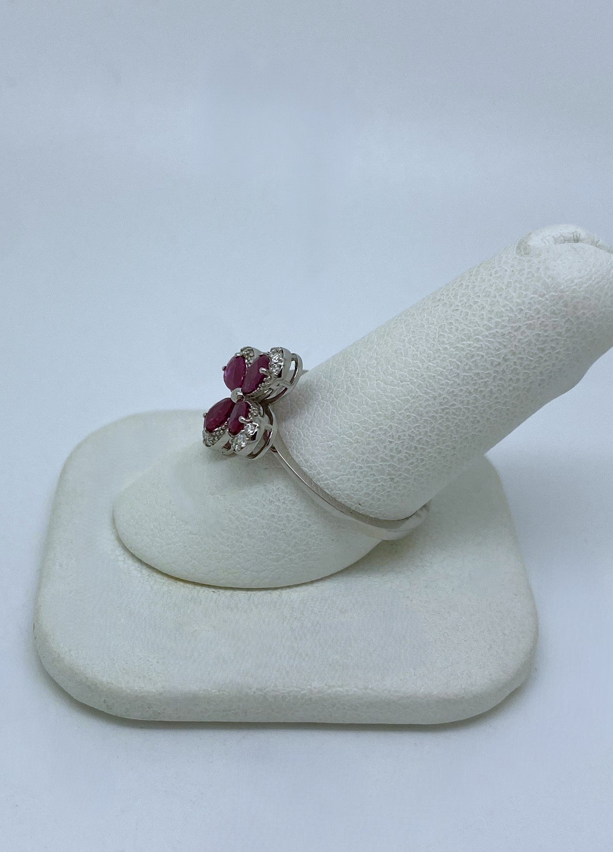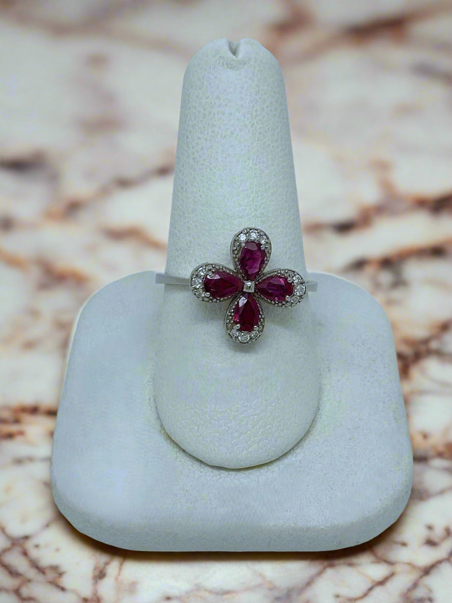 As unique as a four-leaf clover, this 18 karat white-gold ring boasts four rich natural Rubies that total 0.63 carats surrounded in a glittering ribbon of natural Diamonds totaling 0.12 carats.