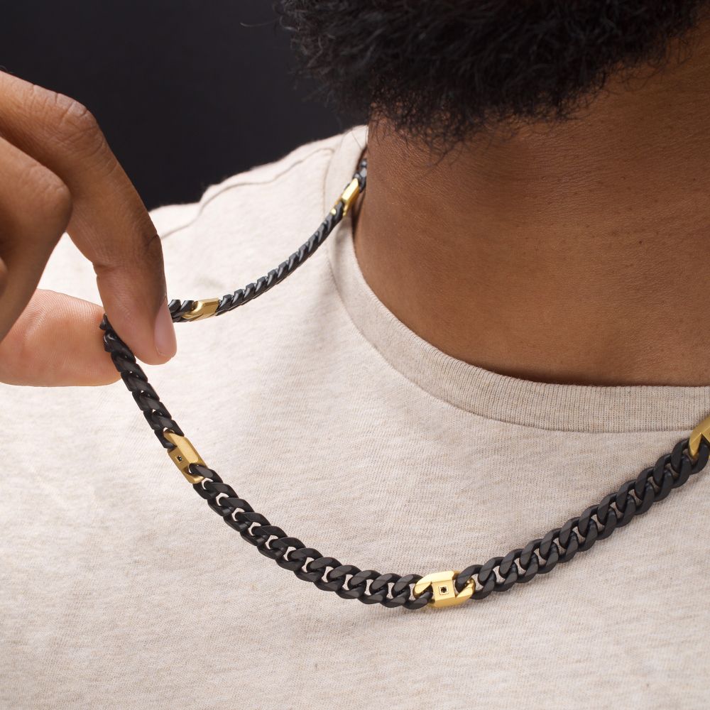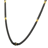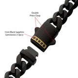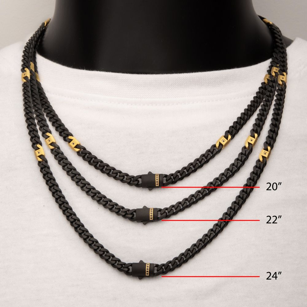 Men's 6mm 22 inch Black IP Steel Matte Finish Miami Cuban Chain Necklace with Genuine Black Sapphire Gem and Eight 18Kt Gold IP Links.