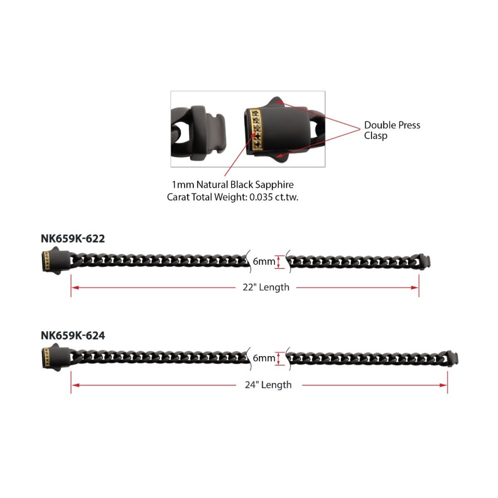 Men's 6mm 22 inch Black IP Steel Matte Finish Miami Cuban Chain Necklace with Genuine Black Sapphire Gem on 18Kt Gold IP Double Press Box Clasp.
