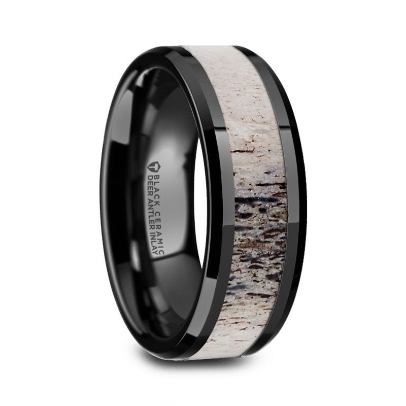 TRES Beveled Black Ceramic Polished Men's Wedding Band with Ombre Antler Inlay - 8mm