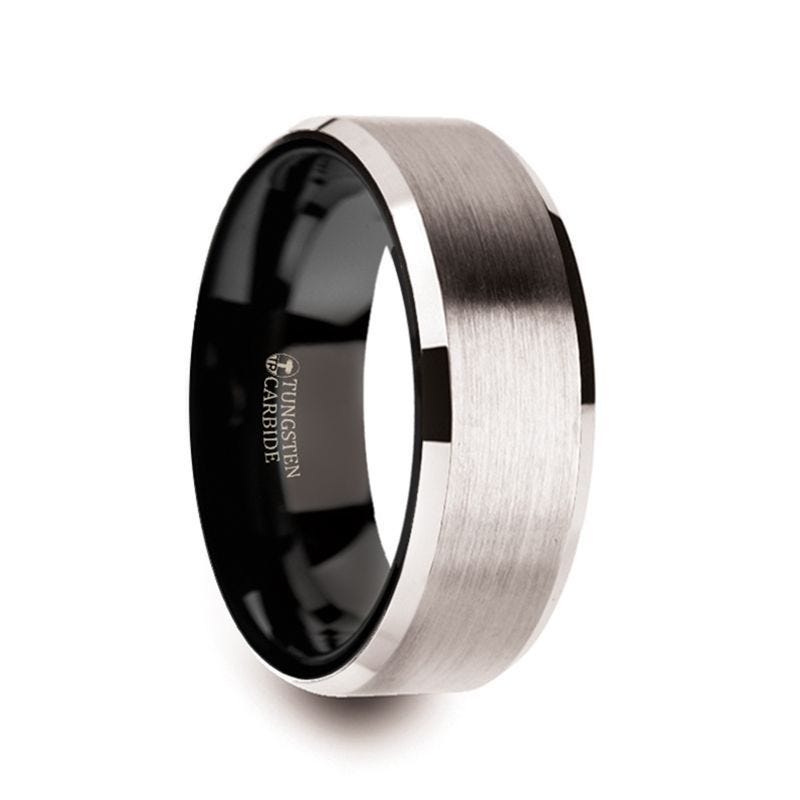 VEGA White Tungsten Brushed Center Men Wedding Ring with Polished Beveled Edges & Black Interior - 8mm