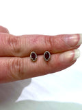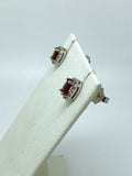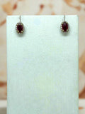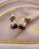 These 14 karat white-gold studs are set with natural oval Rubies totaling 0.5 carats surrounded in a twinkling halo of natural Diamonds totaling 0.04 carats.