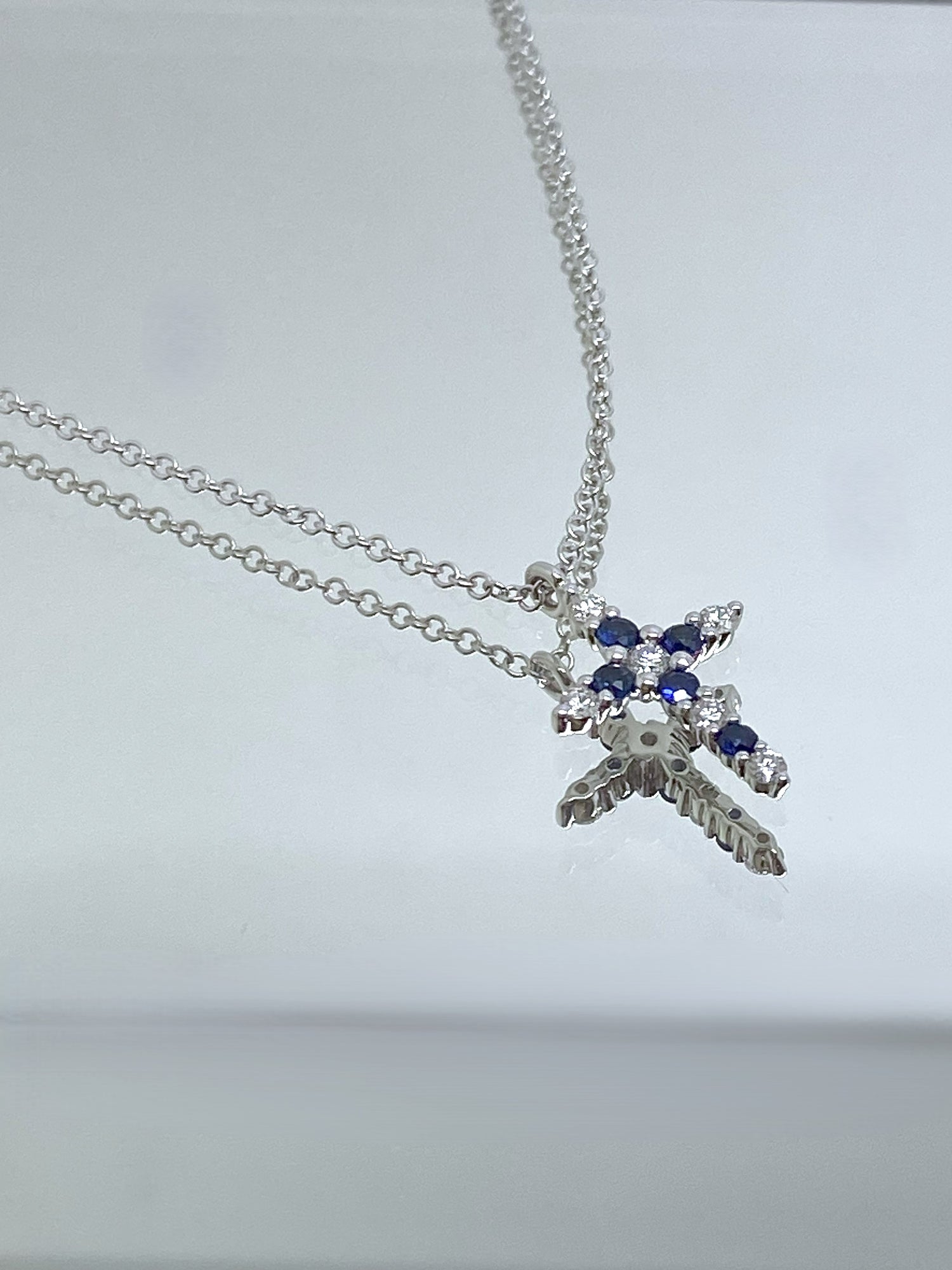Set in 14 karat white gold, 5 round blue Sapphires and 6 Diamonds that total 0.13 carats.
