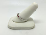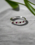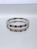 Set in bright 14 karat white-gold, this darling ring features four rich natural Rubies totaling 0.14 carats and three glittering natural Diamonds totaling 0.1 carats.