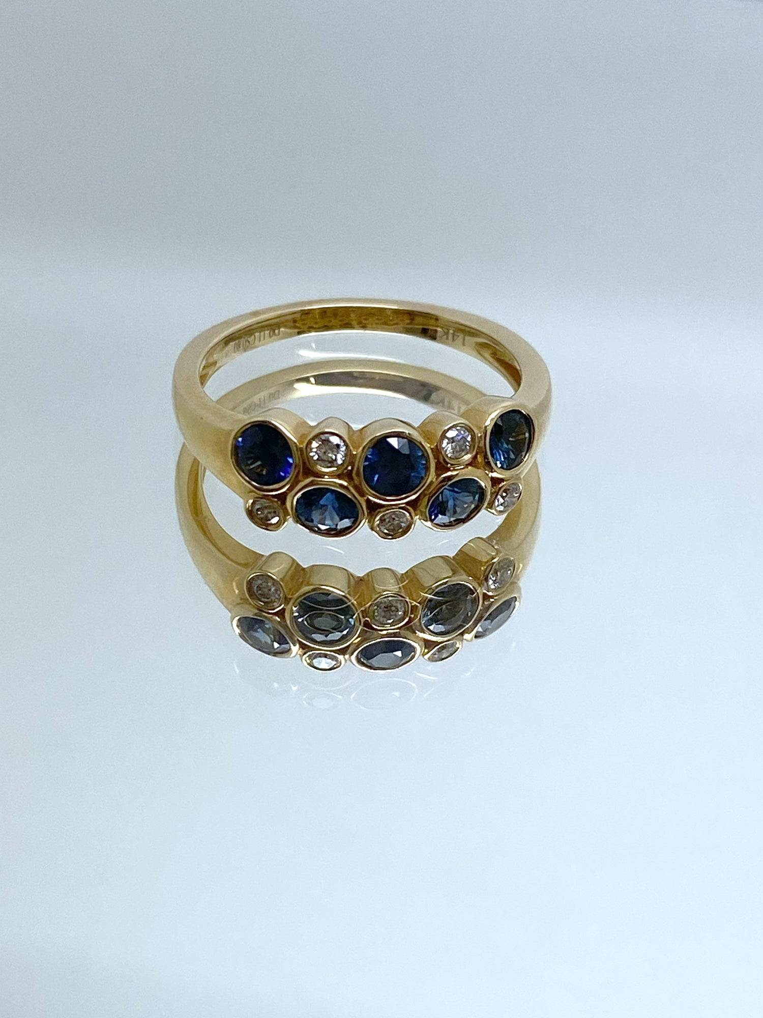 Stand out from the rest with this "bubbly" 14 karat yellow gold ring set with natural blue Sapphires totaling 0.8 carats and natural Diamonds totaling 0.18 carats.