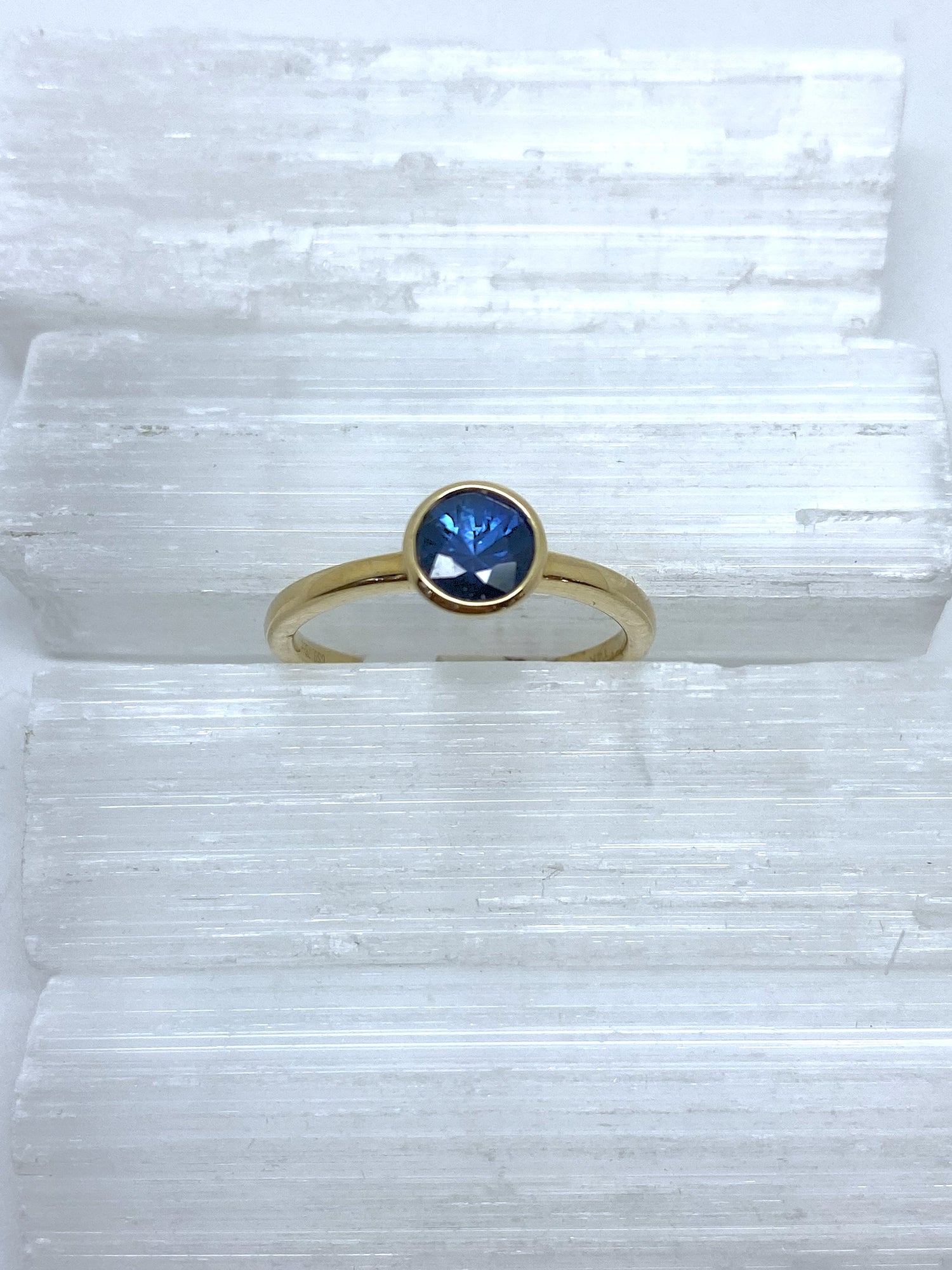 This 14 karat yellow gold bezel setting boasts a stunning rich round blue Sapphire that totals 0.78 carats.