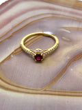This 14 karat yellow-gold ring is set with a natural round Ruby weighing 0.31 carats, nestled in a halo of natural Diamonds that glitter down the sides of the band to a total weight of 0.21 carats.