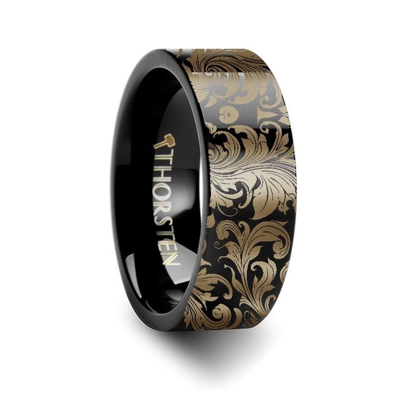 Filigree Leaf Pattern Black Tungsten Engraved Ring - 4mm - 12mm