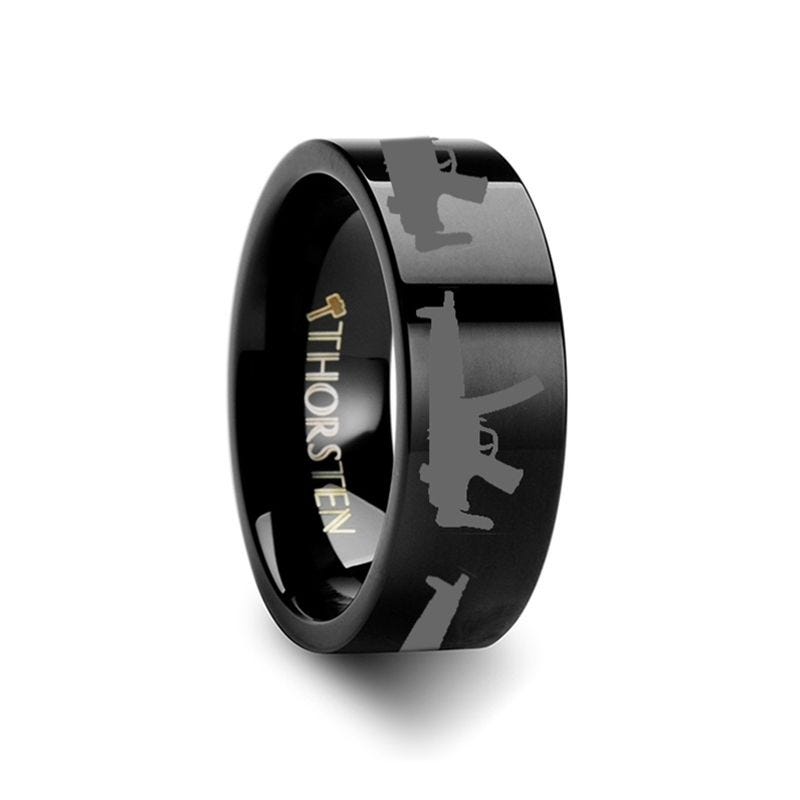 MP5 Print Design Ring Engraved Flat Tungsten Black Ring - 4mm - 12mm