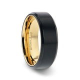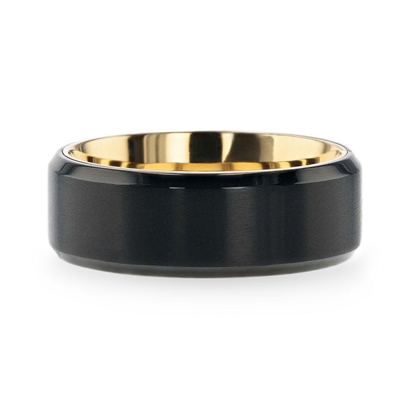 VELVET Flat Brushed Black Titanium Men's Wedding Ring With Yellow Gold Plating Interior And Beveled Polished Edges - 8mm